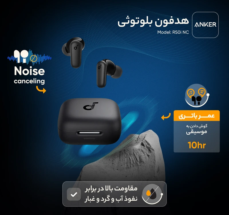 هدفون بلوتوثی انکر مدل R50i با حذف نویز فعال (ANC)، درگاه شارژ USB Type-C، باتری قابل شارژ تا 45 ساعت، مقاوم در برابر پاشش آب و گرد و غبار