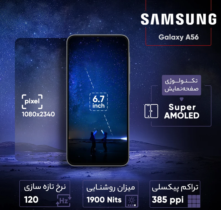 وقتی Galaxy A56 را در دست میگیرید، اولین چیزی که توجهتان را جلب میکند، کیفیت ساخت بالای آن است. استفاده از شیشه مقاوم Gorilla Glass Victus+ در جلو و پشت، در کنار فریم آلومینیومی، حس لوکس و خوشساختبودن را بهخوبی منتقل میکند. با وجود نمایشگر بزرگ 6.7 اینچی، ضخامت تنها 7.4 میلیمتر و وزن متعادل 198 گرمی باعث شده این گوشی کاملاً خوشدست باقی بماند. همچنین مقاومت در برابر گردوغبار و آب با استاندارد IP67 هم خیال کاربران را از استفاده روزمره در شرایط مختلف راحت میکند. سامسونگ همیشه در تولید نمایشگر پیشتاز بوده است و Galaxy A56 هم از این قاعده مستثنا نیست. این گوشی به یک پنل Super AMOLED با نرخ نوسازی 120 هرتز مجهز شده است که روانی، شفافیت و کیفیت تصویر را به بالاترین سطح میرساند. روشنایی بالا تا سقف 1900 نیت، پشتیبانی از HDR10+ و رنگهایی زنده و چشمنواز، تجربهای بینظیر در تماشای ویدیو، بازی یا وبگردی فراهم میآورند. نسبت نمایشگر به بدنه بالا و وضوح مناسب 1080 در 2340 پیکسل هم باعث شده همه چیز شارپ و دقیق به نظر برسد. در این صفحه نمایش قابلیت صفحه همیشه روشن (Always-On Display) هم وجود دارد که بسیار مفید و کاربردی است.