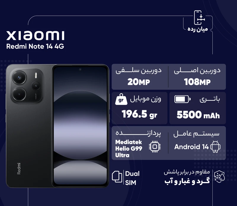 شیائومی Redmi Note 14 4G یکی از جدیدترین گوشیهای سری نوت شیائومی است که همواره از پرفروشترین سریهای شیائومی بودهاند. این موبایل که در ژانویه 2025 معرفی شد، با ابعاد 163.3x76.6x8.2 میلیمتر و وزن 196.5 گرم طراحیای زیبا و ارگونومیکی دارد. از طرفی با مقاومت در برابر پاشش آب و گرد و غبار و داشتن استاندارد IP54 در شرایط مختلف دوام و پایداری بیشتری ارائه میدهد. صفحه نمایش 6.67 اینچی AMOLED با نرخ بروزرسانی 120 هرتز و روشنایی 1800 نیت، نمایش تصاویری زنده و شفاف را تضمین میکند. فناوری Always-on Display تجربهای منحصربهفرد در مشاهده محتوا فراهم میکند. محافظ Corning Gorilla Glass 5 نیز صفحه نمایش را در برابر خط و خش محافظت میکند. پردازنده بهینه Mediatek Helio G99 Ultra با معماری 6 نانومتری، در کنار پردازنده گرافیکی Mali-G57 MC2، عملکردی روان و بینقص در اجرای اپلیکیشنها و بازیهای نیمه سنگین ارائه میدهد. باتری 5500 میلیآمپرساعتی با قابلیت شارژ سریع 33 وات نیز استفاده طولانی مدت و شارژ سریع را تضمین میکند. دوربین اصلی 108 مگاپیکسلی با لنز عریض و فناوری فوکوس PDAF، تصاویری شفاف و حرفهای ثبت میکند. دوربین ماکرو 2 مگاپیکسلی تجربهای جذاب برای عکاسی از جزئیات فراهم میکند. دوربین سلفی 20 مگاپیکسلی برای عکسهای شخصی و تماسهای تصویری بسیار مناسب است. در پایان، ردمی نوت 14 4G با سیستمعامل Android 14، بلوتوث 5.3، و حسگر اثرانگشت زیر صفحه نمایش، Redmi Note 14 4G مجموعهای از طراحی زیبا، عملکرد قدرتمند و امکانات متنوع را ارائه میدهد که نیازهای کاربران را بهخوبی برآورده خواهد کرد.